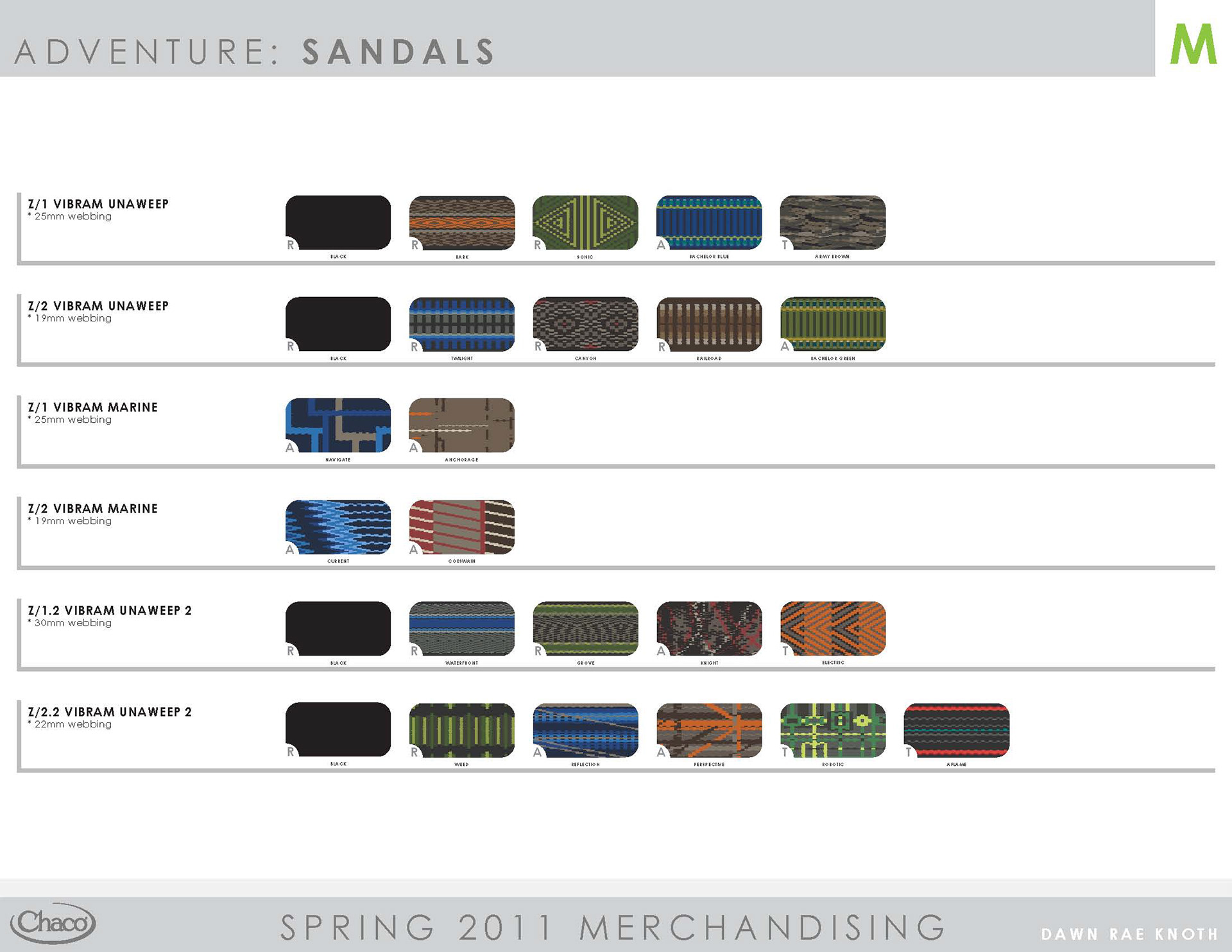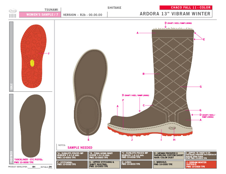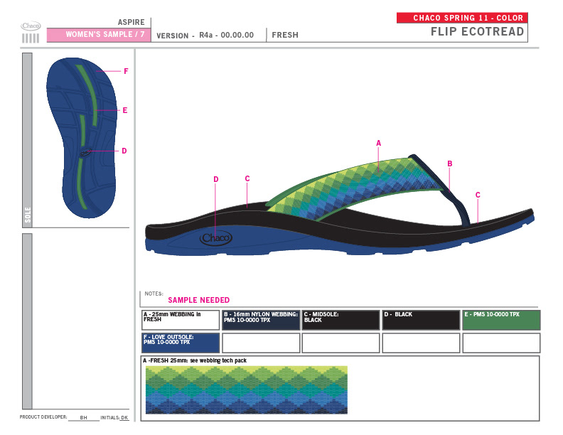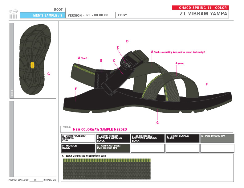 Chaco will always hold a special place in my heart. In 1999, I started my career in the outdoor industry there, back when it was a small company literally making sandals in lovely Paonia, CO. Once I started my own business, I consulted with them, providing the full scope of services - trend/color/merchandising/webbing design. When Wolverine purchased Chaco, I continued consulting with them for several years, through the 2012 season; this time leading a creative team. I set the trend direction seasonally, created the merchandising plan, and designed the color palette and strategy. Working as a team, I guided the creative process through color application, webbing design, and design reviews.