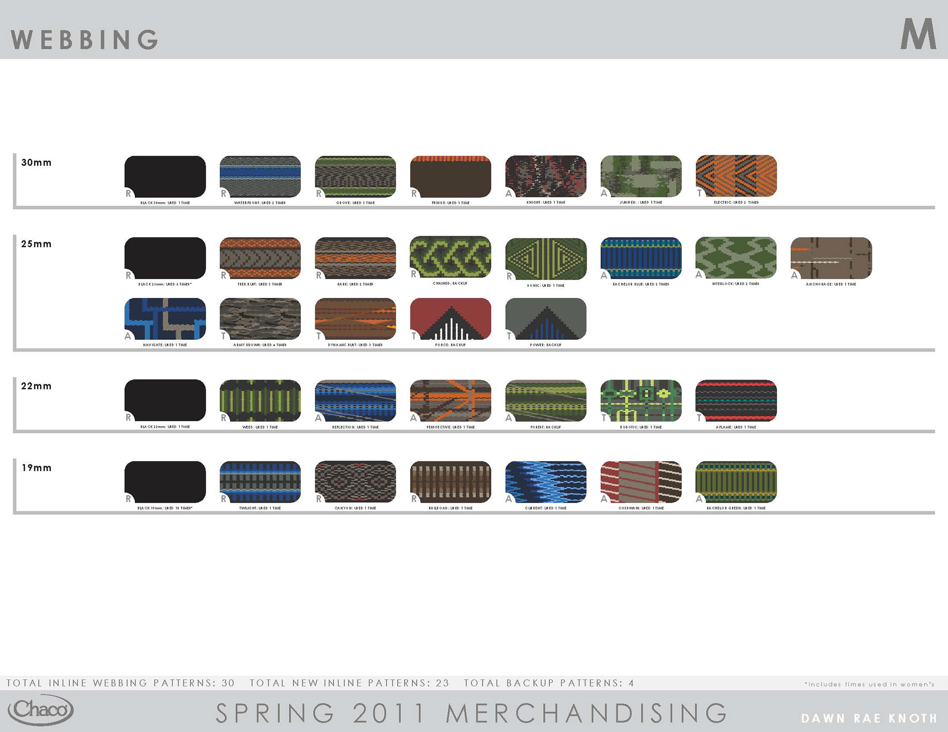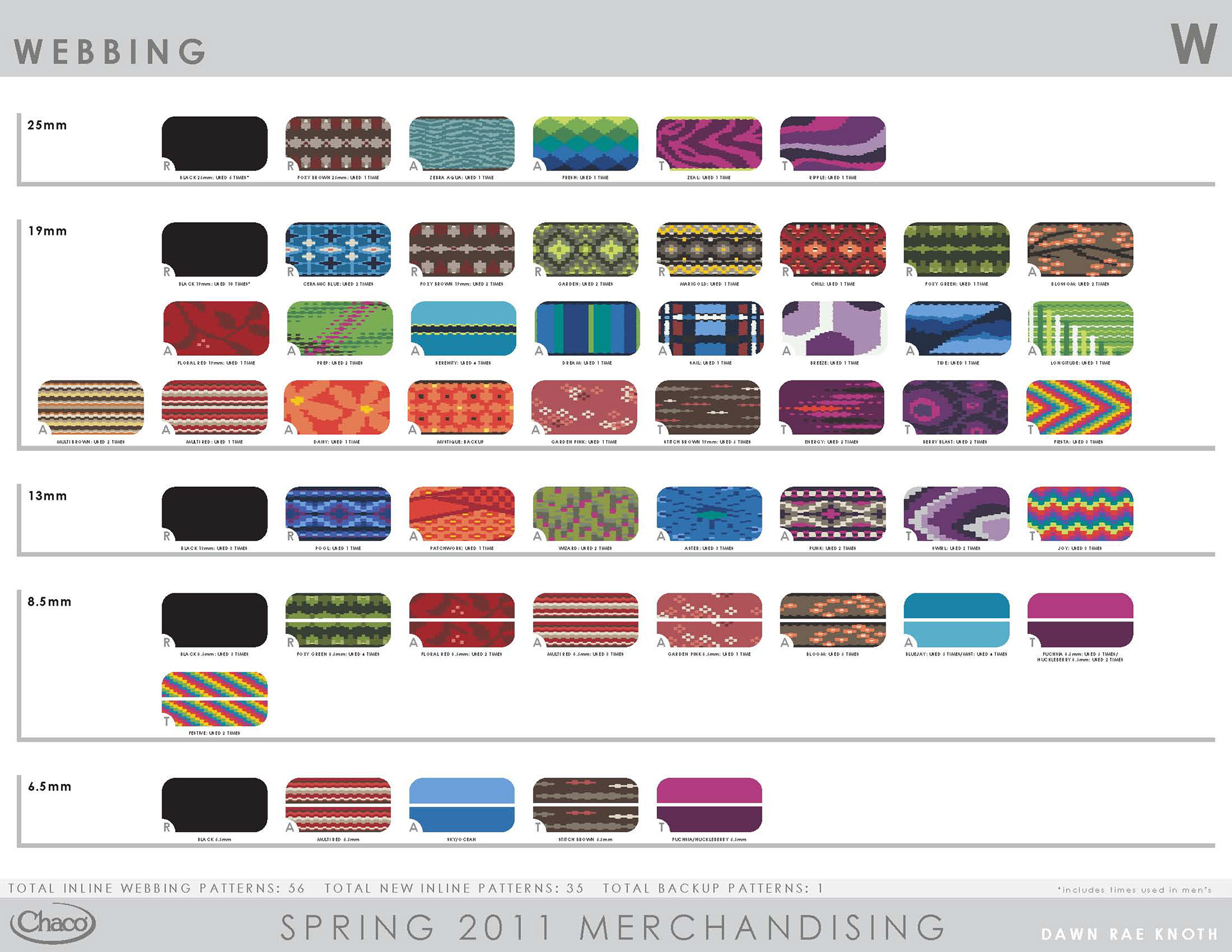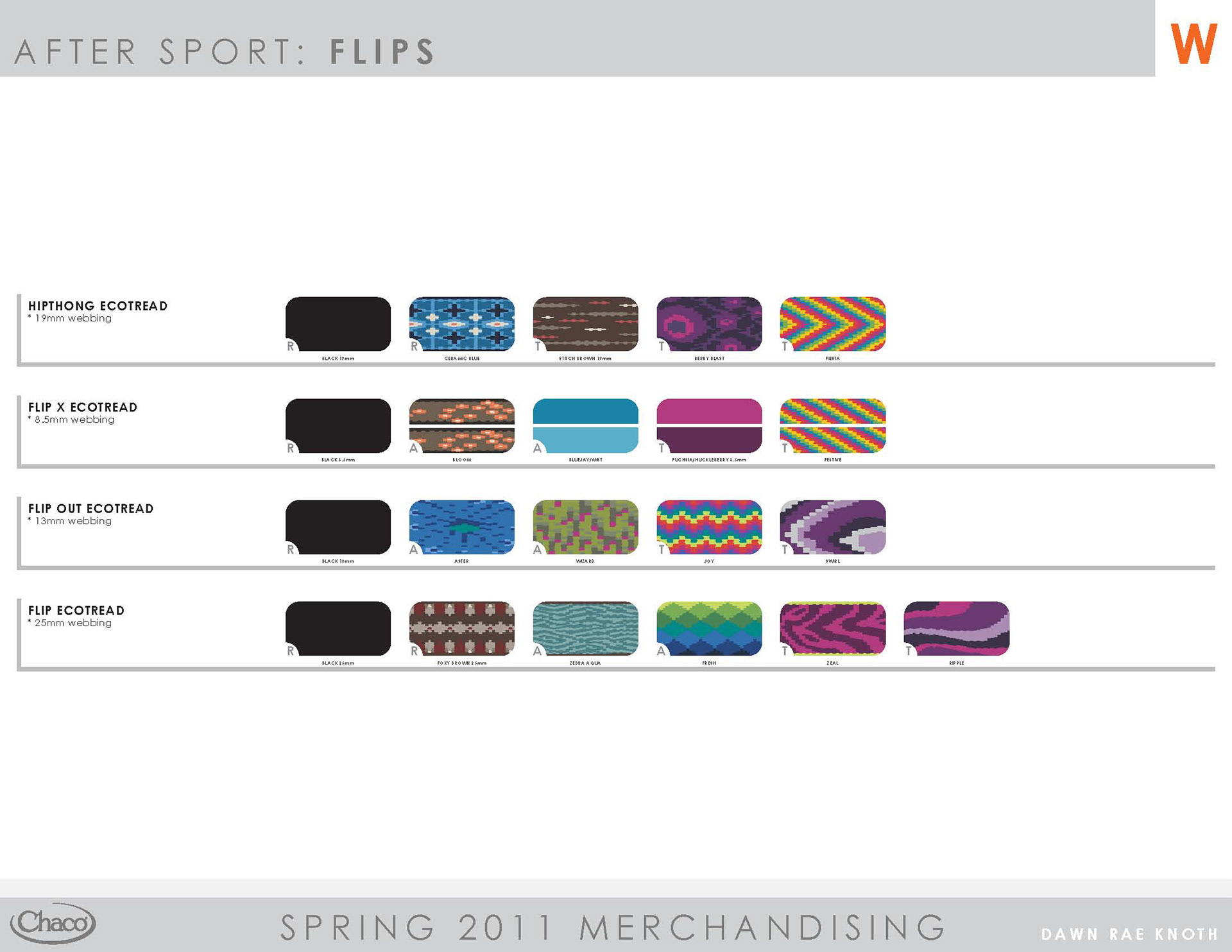 Chaco will always hold a special place in my heart. In 1999, I started my career in the outdoor industry there, back when it was a small company literally making sandals in lovely Paonia, CO. Once I started my own business, I consulted with them, providing the full scope of services - trend/color/merchandising/webbing design. When Wolverine purchased Chaco, I continued consulting with them for several years, through the 2012 season; this time leading a creative team. I set the trend direction seasonally, created the merchandising plan, and designed the color palette and strategy. Working as a team, I guided the creative process through color application, webbing design, and design reviews.