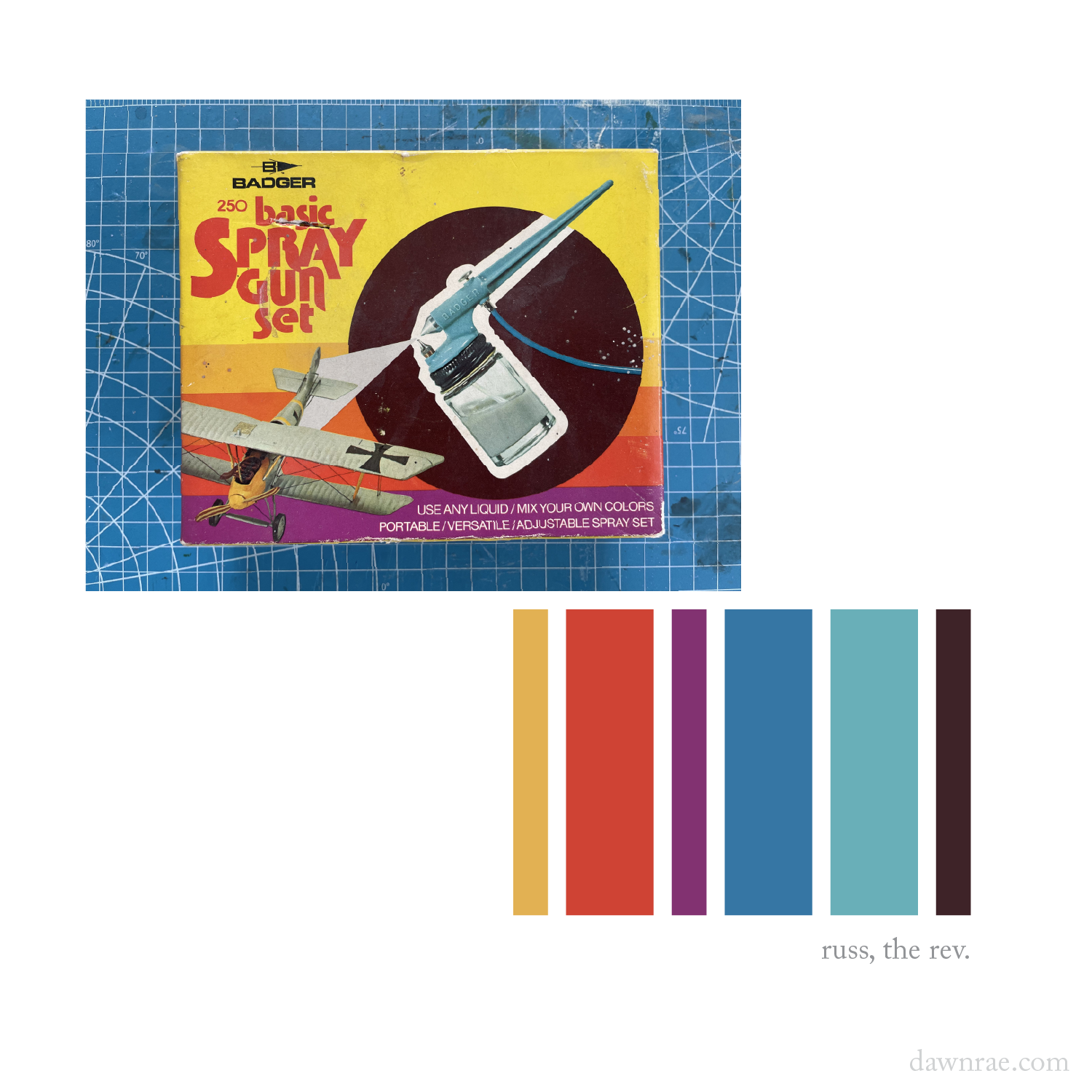 This spray gun set was one of the finds on the shelf. According to the included pamphlet, it was the choice of the 80’s. I love the retro colors, especially paired with his trusty cutting mat, so I wanted to combine them in a palette.