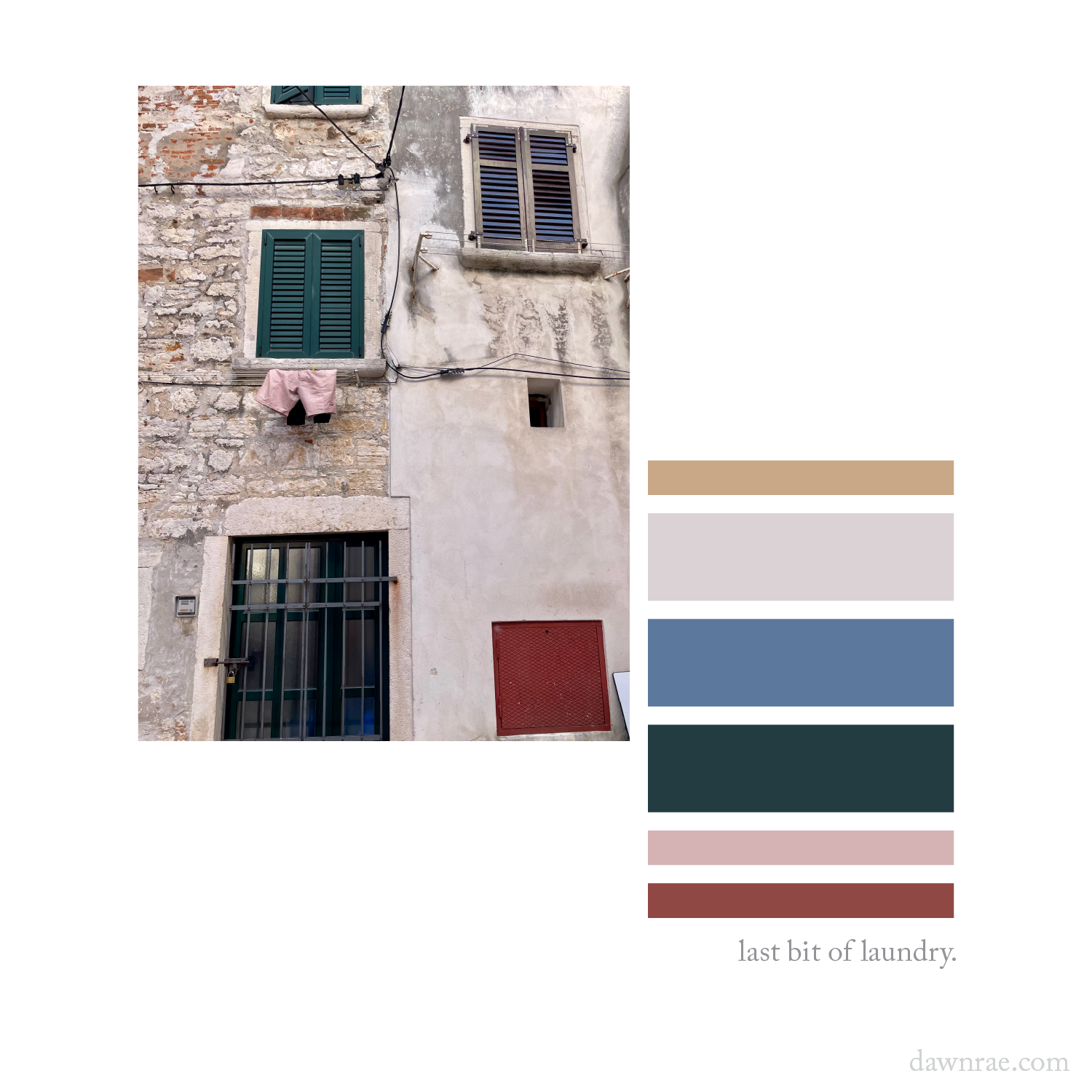 I love the soft, dusty rose of these (perhaps forgotten, perhaps favorite) shorts and the low contrast between them and the warm neutral walls. They mix together to create this wonderfully textured, muted canvas for the slightly desaturated jewel tones of the emerald and cobalt shutters and the ruby grate.